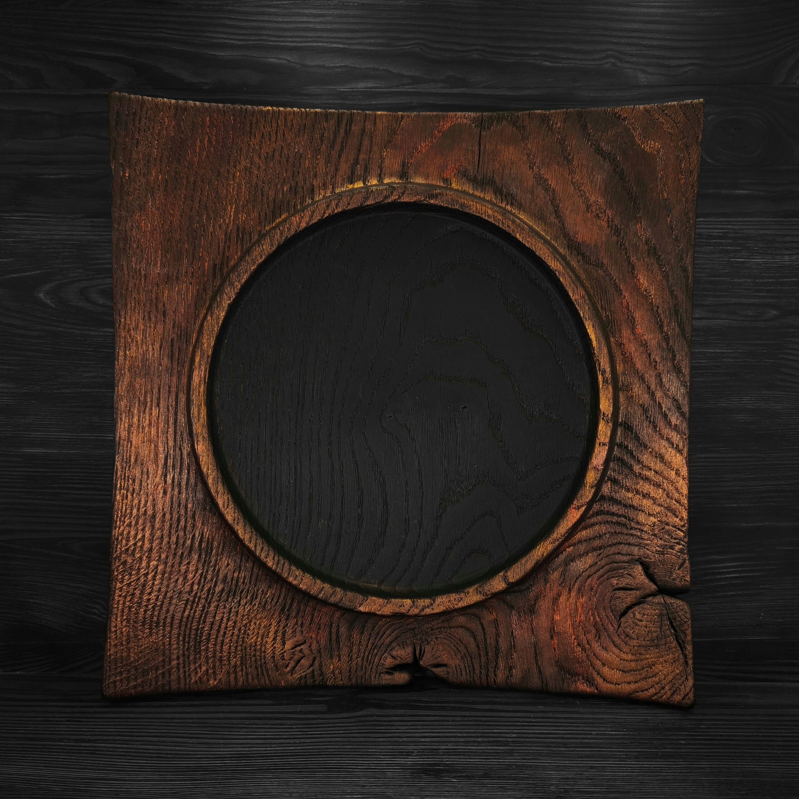 🔥 Jedinečný dubový talíř zrozený z ohně – každý kus vypráví vlastní příběh skrze opálený povrch a třpytivé metalické pigmenty.