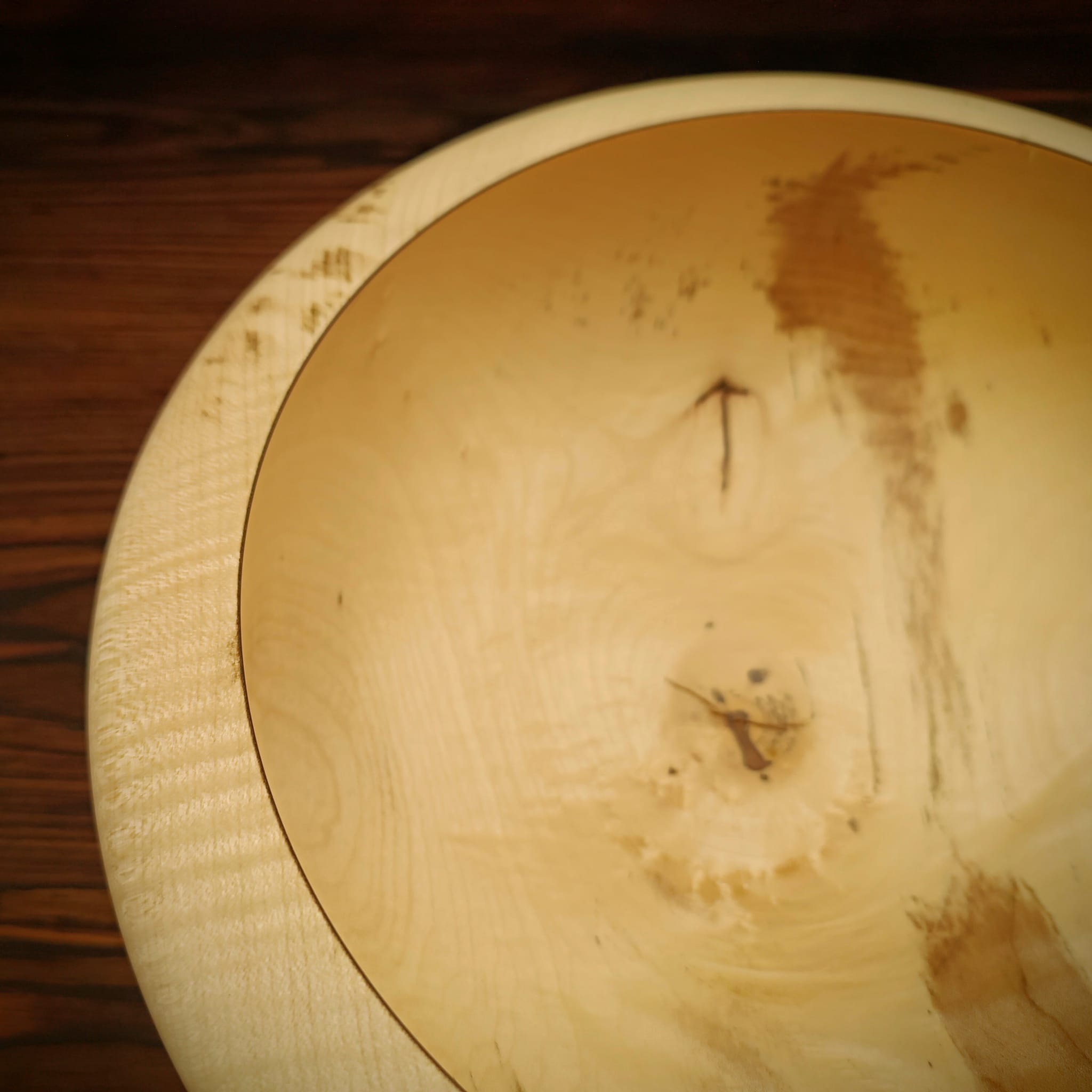 Elegantní tenkostěnná miska z javorového dřeva s přesazeným okrajem. Vnitřní hrana je zvýrazněna opálením. Povrch je sametově lesklý a dává vyniknout pro javorové dřevo typickému povrchu s odlesky.