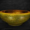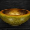 Spaltovaná ořechová miska (23 × 9 cm) s krakelovaným žlutozeleným povrchem připomínajícím dračí kůži, zlatým okrajem s červenou linkou a přirozeně kresleným vnitřkem.